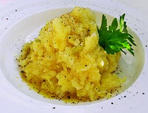 Wenn Kartoffeln und Zwiebeln weich sind, sie in einen tiefen Teller geben und mit der Gabel zusammen zerdrücken bis sie gut durchgemischt sind.